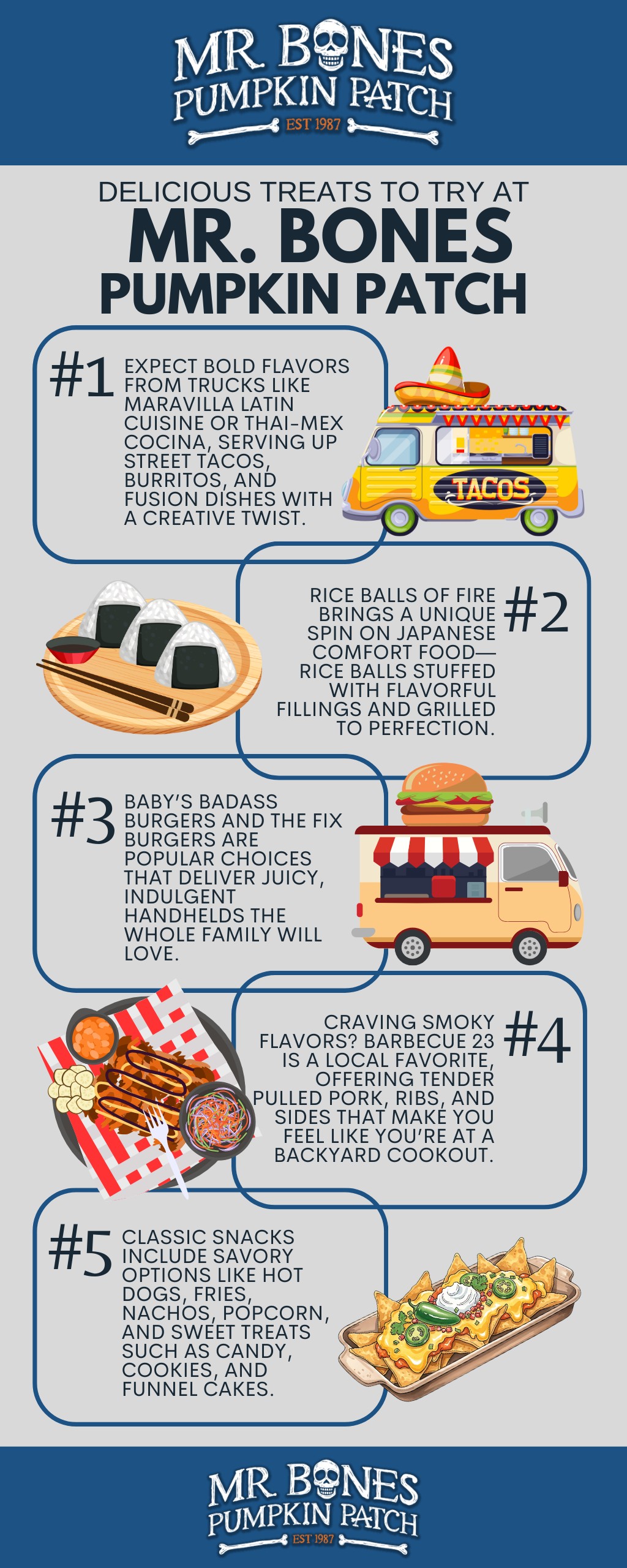 This guide takes you on a tour of delicious Mr. Bones Pumpkin Patch treats to try at Mr. Bones Pumpkin Patch, from its rotating lineup of gourmet food trucks to classic autumn snacks that keep the whole family fueled for a full day of fun.
